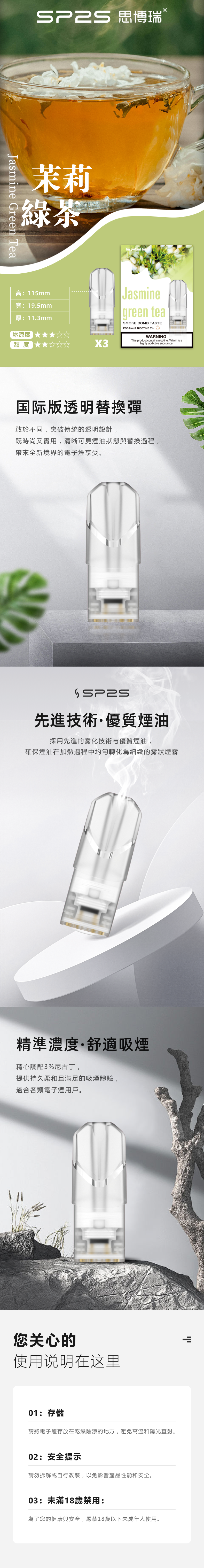 思博瑞SP2S 002D透明替換煙彈 口味豐富 充填高品質煙油 一盒3顆煙彈 兼容二代主機 茉莉綠茶